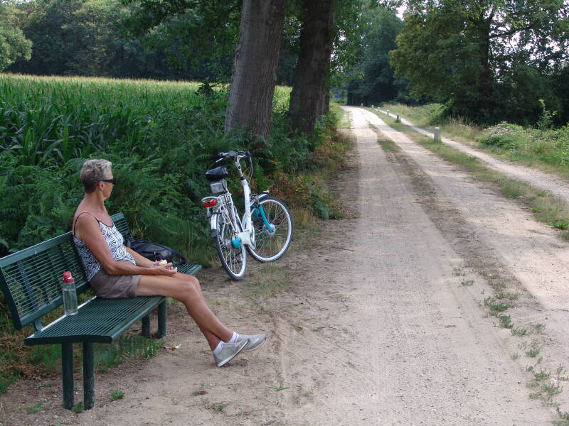 De knooppunten route die mijn vrouw uitgestippeld had ging gelukkig veel door bos en heide en leuke dorpjes, rusten en drinken deden we op tijd want het was warm vandaag. Op de terug weg nog even een drankje doen bij de restaurant aan de waterplas. Bij terug komst op de camping 52 km op de teller.