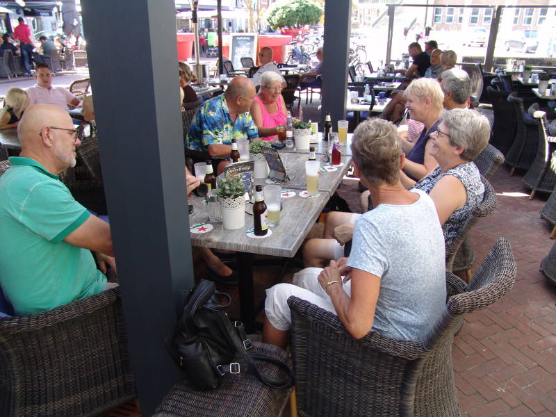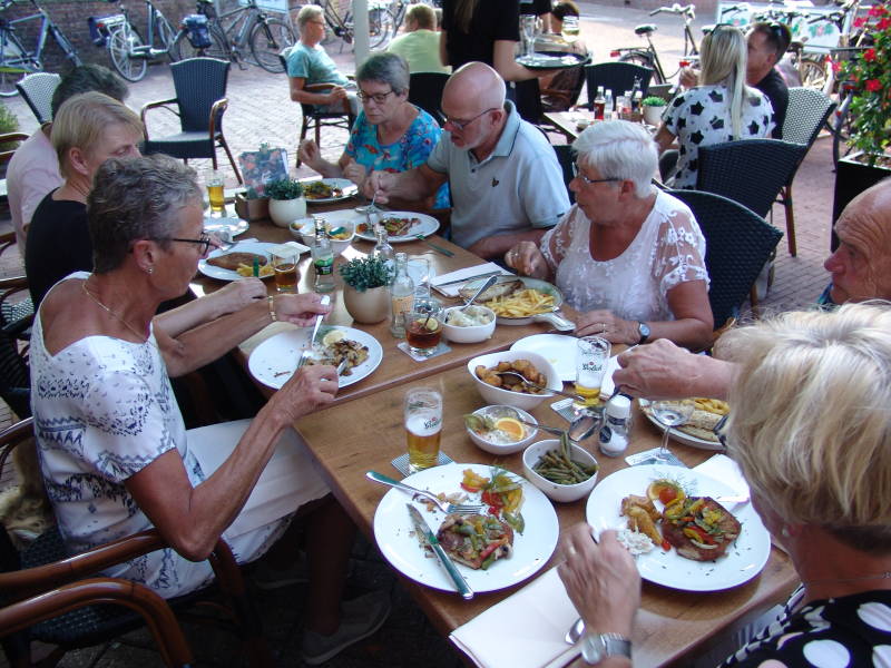Na de bezichtiging vervolgen we wederom onze route waar we na enige tijd aan komen in Hengelo waar we in verband met de hitte een versnapering te nemen. Tegen 16.00 waren we weer op de camping, een mooie route langs water, door bos en met prachtig mooi weer. Afstand 37 km. We drinken een biertje en tegen 18.00 vertrekken we naar het centrum van Delden waar we met zijn allen lekker gaan genieten van onze diner.