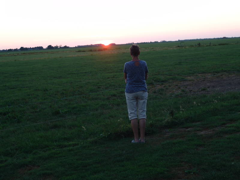 Zaterdag avond 14 Juli vanaf de camperplaats zonsondergang in Woudsend, altijd leuk om te zien. Zondagmorgen na het ontbijt en diverse werkzaamheden stappen we tegen een uur of 11 op de fiets voor een rondje Slotermeer. Na 12 km komen we aan in Sloten en drinken hier een kop koffie met een appelgebakje. Sloten is ook een mooi oud dorpje en ook hier lopen de grachten weer door het dorp.