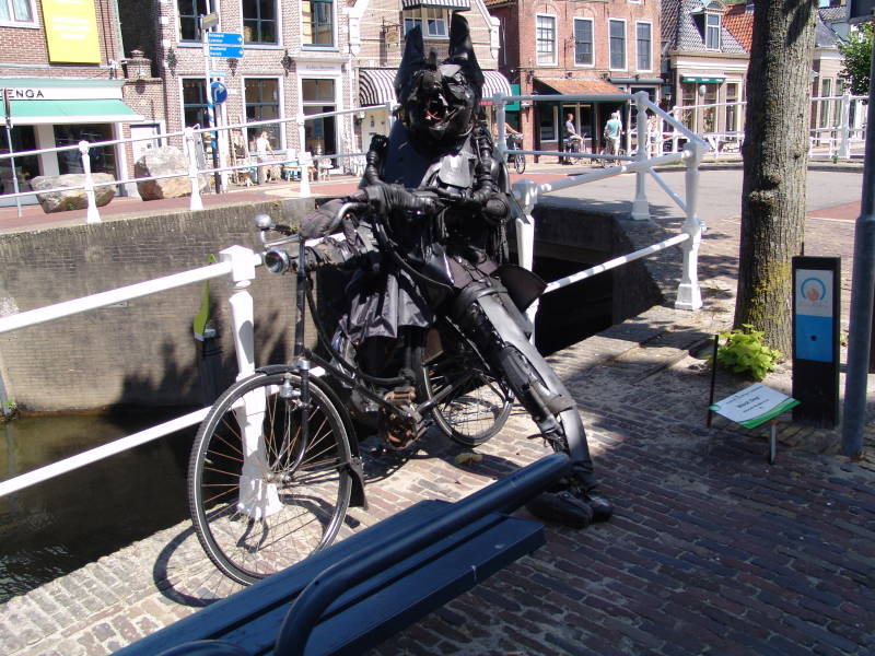 Na de koffie verlaten we het mooie Sloten en fietsen richting Balk waar we na een kleine 5 km aankomen en ook hier weer de grachten die door het dorpje lopen. Nog even een kunstwerk op de foto zetten namelijk een zwarte hond op een oude oma fiets gelast, toch knap gedaan.