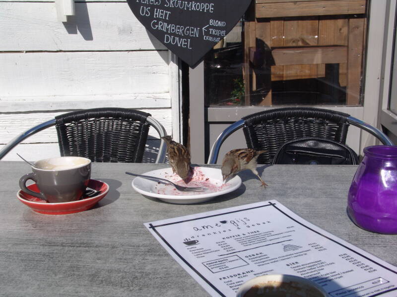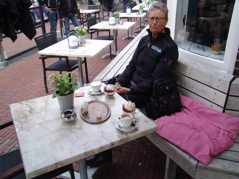 Zondag 20 september stappen we tegen half elf op de fiets en fietsen vanuit Workum naar Hindeloopen langs het IJsselmeer over een afstand van 7 km. Bij aankomst in Hindeloopen nemen we eerst een kop koffie met een heerlijk stukje gebak, de krummels zijn voor de vogels.