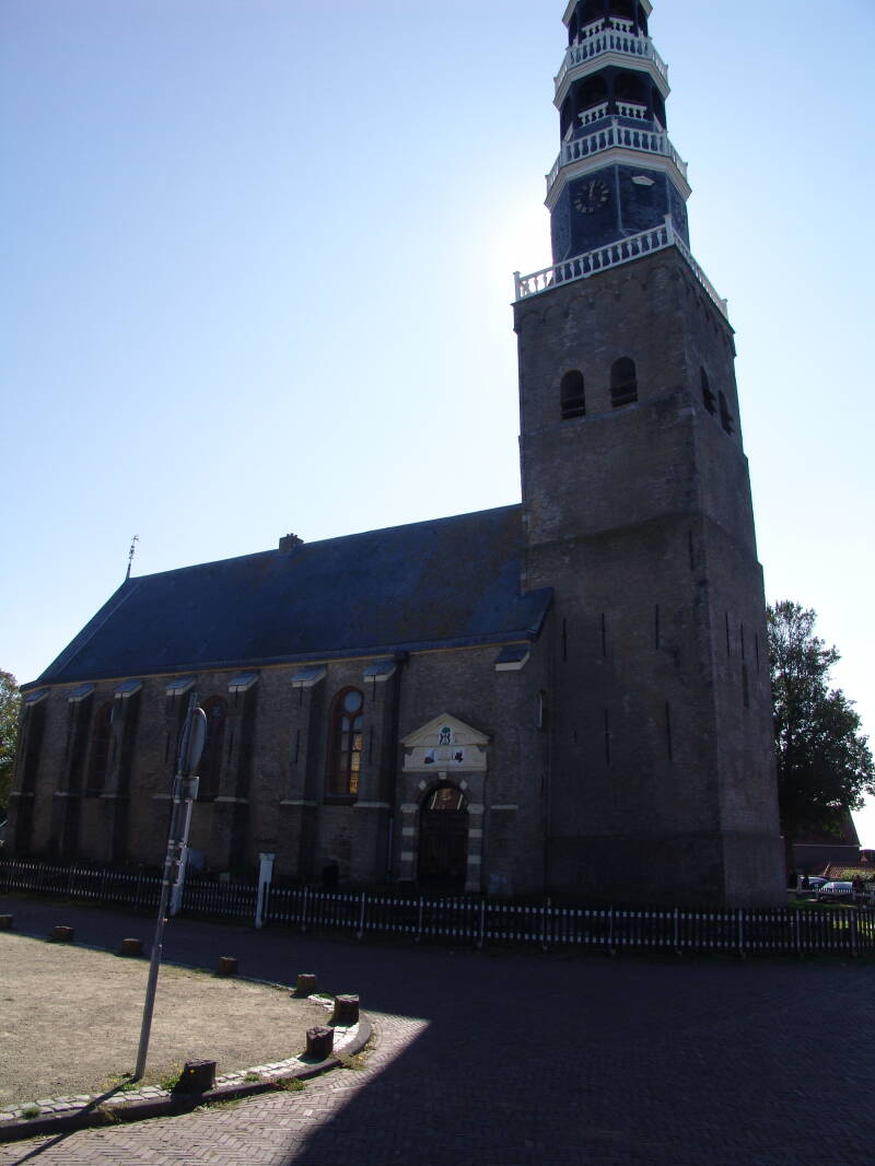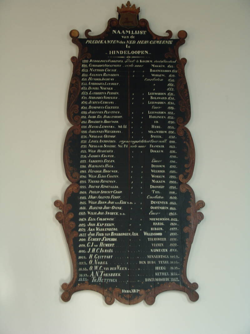 Na de koffie wandelen we door het scheepsvaart dorp van het Ijsselmeer langs de grote kerk en gaan hier even naar binnen en zien dat er een bord hangt met namen en jaar tallen die hier allemaal predikant zijn geweest.