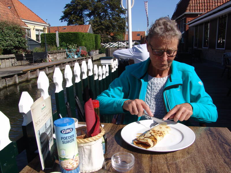 Tegen 13.00 uur eten we een lekker pannenkoek en daarna vervolgen we weer onze weg door het prachtige scheepvaart dorp. Tegen 15.00 uur stappen we weer op de fiets richting de camper.