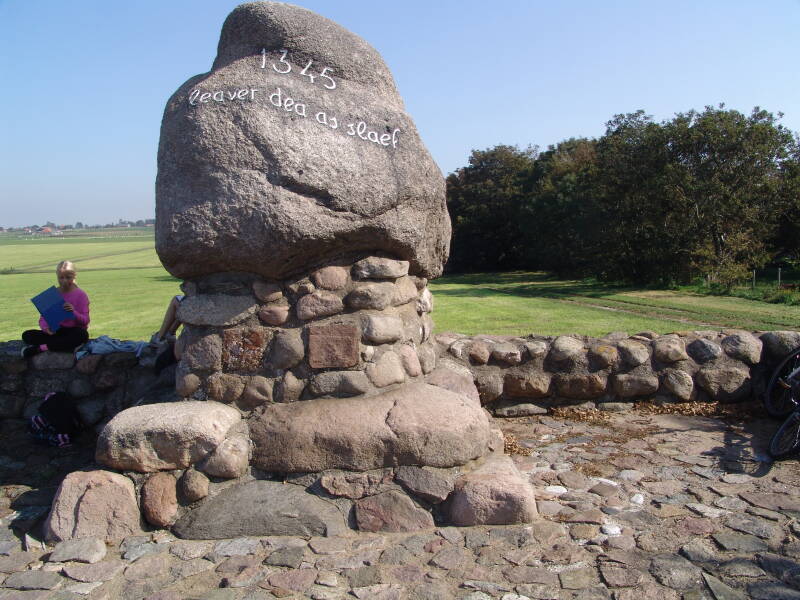 Na de koffie vervolgen we onze fietsroute en fietsen Rijs uit naar Mirns, Laaxum. Hier was vroeger een vissershaven maar daar is niets meer van te zien, wel een visboer op deze plek en hier hebben we dan ook genoten van een heerlijk gebakken visjes. Verder onderweg komen we nog een gedenk steen tegen waar ook kinderen zitten die een opdracht moeten maken over de slavernij. lezen wat er staat maken een foto en fietsen weer door naar de camper. Mooie route vandaag 41 km.
