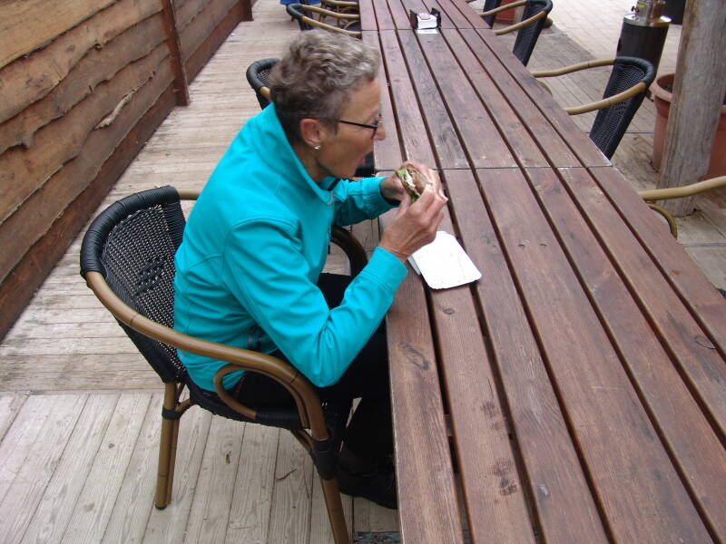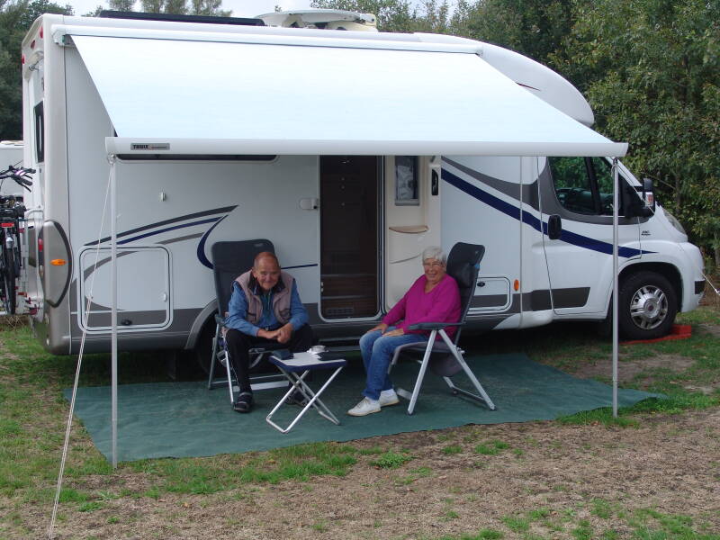 We gaan eerst een broodje eten en even na 13.00 uur arriveerden Hans en Willy vullen hun camper eerst met water en nemen plaats naast ons op de camperplaats. We hebben ze meer dan een jaar niet gezien en er was dan ook heel wat om bij de praten. Het begon te regenen en we draaiden de luifel uit zo dat we toch nog gezellig met elkaar konden praten.