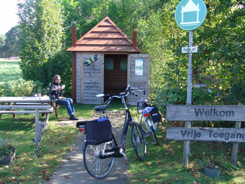 Maandag 28 september regende het en dus bleven we nog even wat langer in bed liggen en heeft verder de hele dag geregend en dus niets ondernomen. Dinsdag 29 september prachtig mooi weer en na de koffie stappen we op de fiets om wat boodschappen te doen bij de Jumbo in Eersel 7 kilometer vanaf de camperplaats. Na de middag hebben we een fietstocht gemaakt rondom Eersel en na ongeveer 15 kilometer zagen we een bord picknick tafel linksaf 300 meter dus daar gaan we wat drinken. Het bleek van een boer ((loonbedrijf) trost op de boer te zijn. Deze had hier ook een blokhutje geplaatst met televisie er in hoe het boeren leven tot stand komt c.q. geoogst wordt. Kinderen namen hier volop gebruik van en ook mochten de kinderen een tekening achter laten en de meeste kinderen tekende een tractor. Even na 16.30 waren we weer terug bij de camper. Fietsen achter op de camper en genieten buiten nog van een lekker pilsje voor mij en voor de vrouw een frisdrankje.