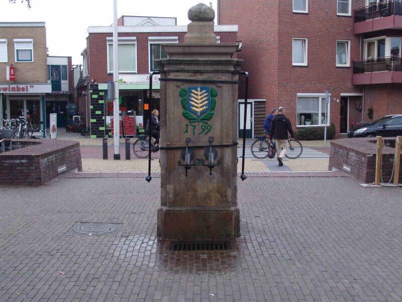 de meneer die op het bankje zat vertelde ons dat deze oude Rijssense waterpomp weer terug is geplaats op zijn oude plaats waar hij nu staat. Deze waterpomp stond jaren achter de schildkerk maar op verzoek van de bewoners is deze oude werkende waterpomp weer terug gezet.