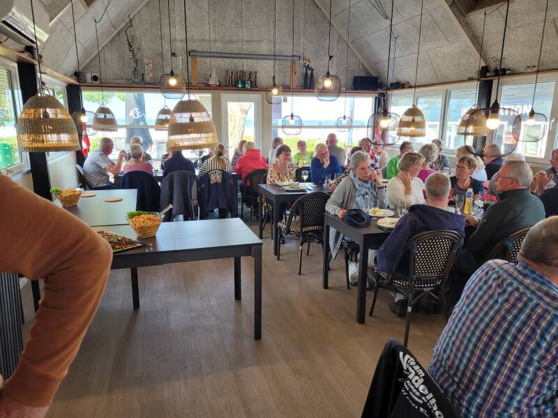 Op een gegeven moment was het droog en drinken we nog een kopje koffie met Onne en Trienke voor het laatste stuk naar de camping. Tegen 18.uur verzamelen we ons allemaal voor een af scheids diner en rijden naar het restaurant.