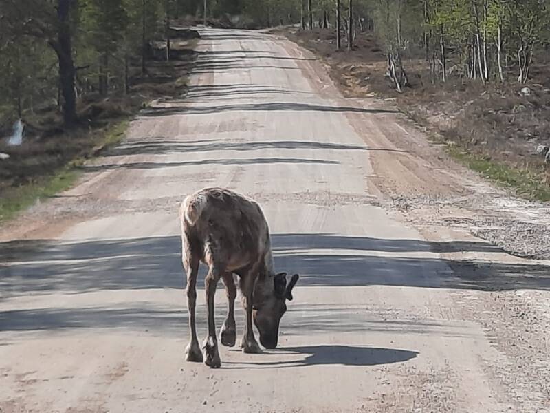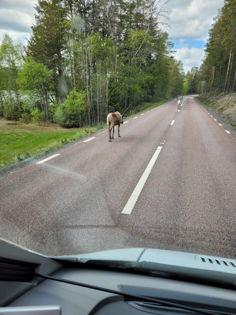 Woensdag 7 juni verlaten we Näss camping Dalarna en rijden naar Sörälvens Fiske Camping te Idre over een afstand van 238 km. We rijden door het dal van de rivier de Osterdaläven een combi van watervallen en de ruige woeste bergwereld. Bij Salen op een parkeerplaats met een klein overdekt winkel centrum hebben we koffie gedronken. Na de koffie weer door gereden verder door Salen en even later zagen we twee groepen Elanden de weg op rennen, Boven in de bergen was nog sneeuw te zien.