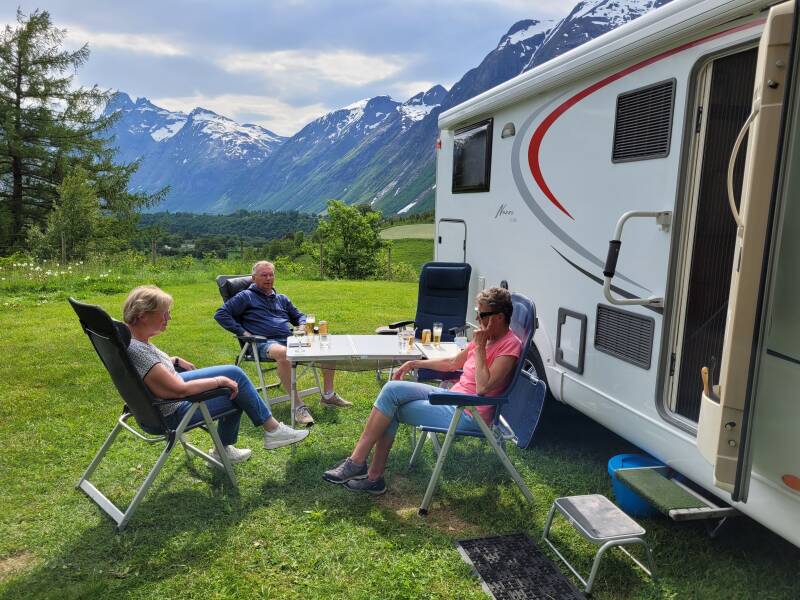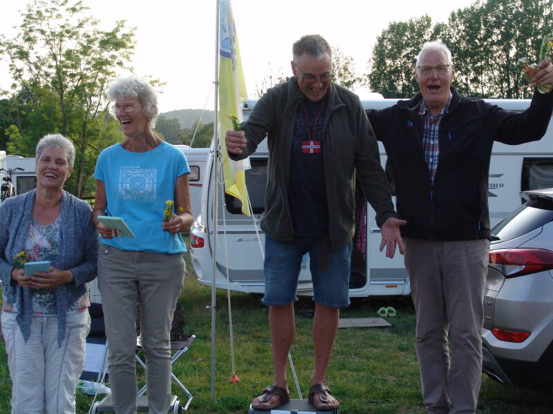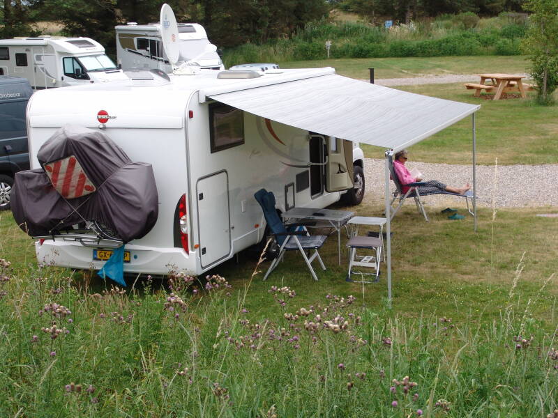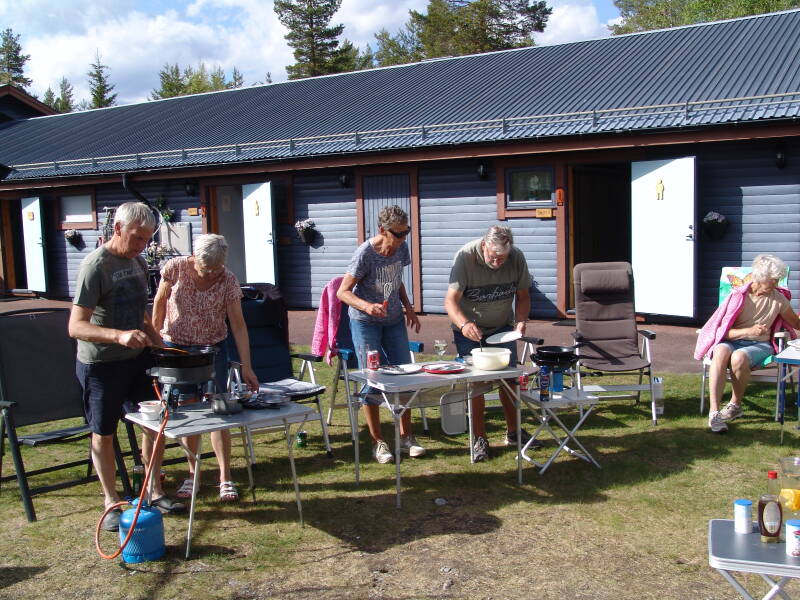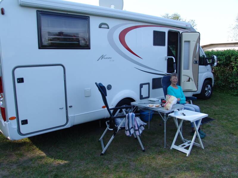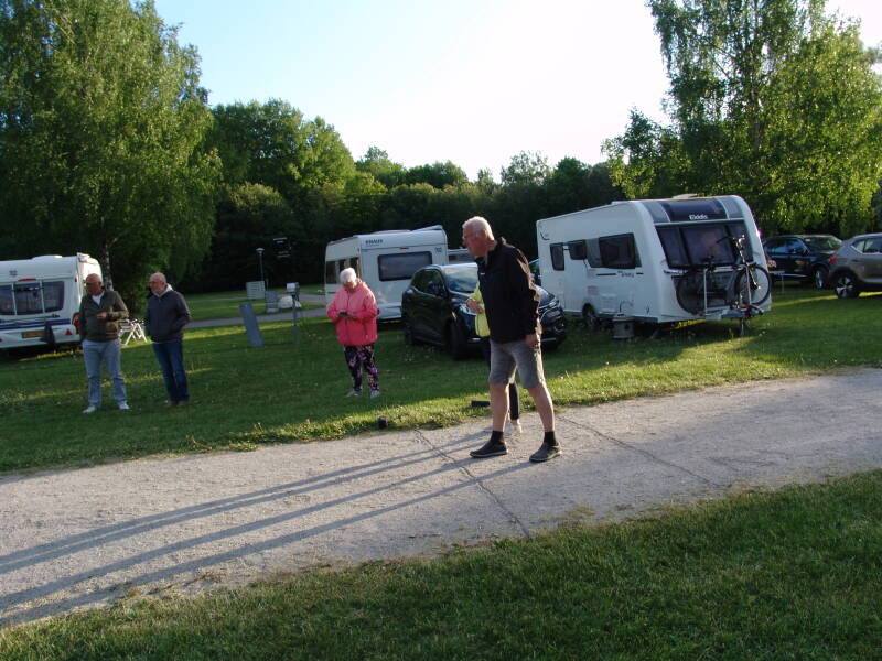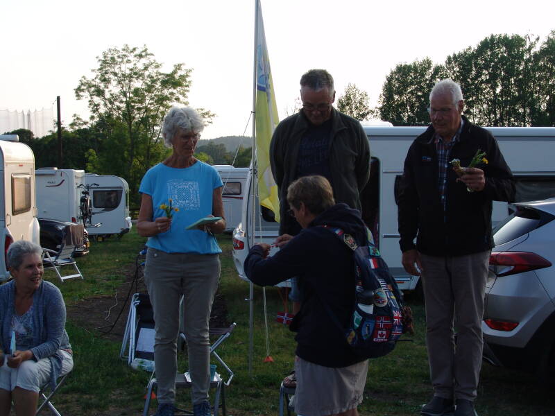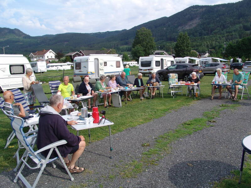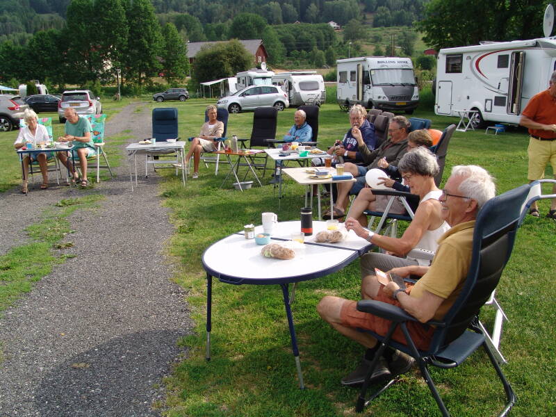 Nadat we de camper op zijn plaats hebben gezet k worden we uitgenodigd bij Han en Door de reisleiders voor de reis Zweden-Noorwegen voor een kennis maken gesprek onder het genot van een heerlijk kop koffie met nog twee echtparen. Na de middag verkennen we de camping en lopen langs de braderie die op de camping was georganiseerd.