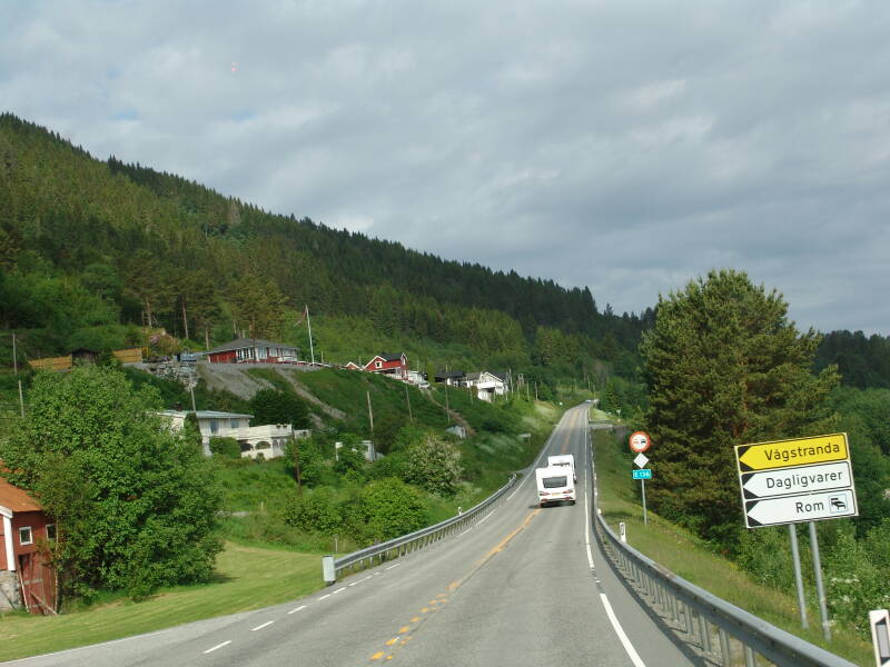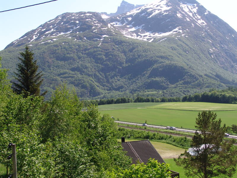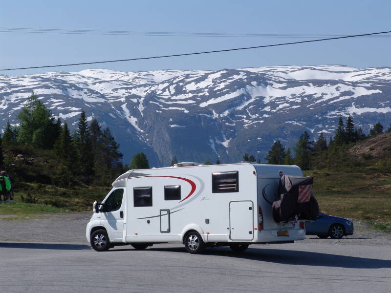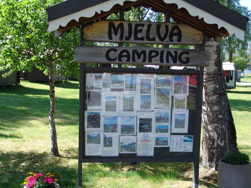 De laatste 50 kilometer ging met een behoorlijke stijging en uiteraard een steile daling en soms heel dicht langs de fjorden. We waren na de middag tegen 3 uur op de camping met uitzicht op de hoogste berg van Noorwegen.