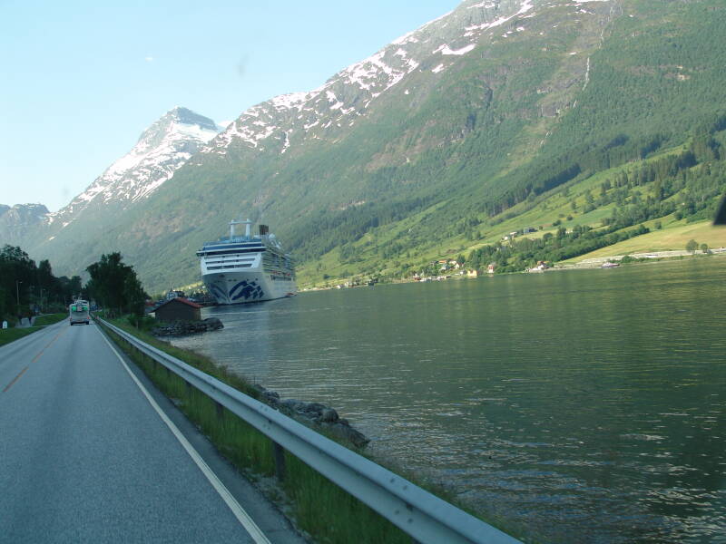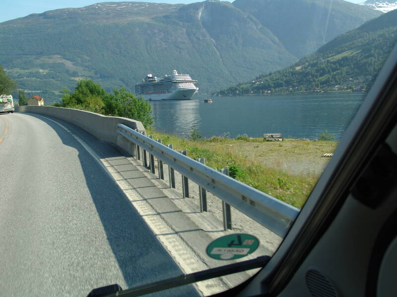Donderdag 15 Juni hebben we een reisdag van Strijn naar Gudvangen waar we naar Gudvangen camping rijden over een afstand van 235 km. Vanaf de camping rijden we via Hoeff, Olden, Innvik, Bijrkjeld. Onderweg weer prachtig uitzicht over de bergen en meren. Hier zijn van die grote prachtige cruiseschepen genoeg.