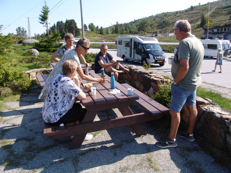 We zien in de verte een parkeerplaats waar we stoppen om met Onne en Trienke een kopje koffie te drinken. Even later komen Rens en Jana er ook even gezellig bij zitten. Dit gebied heet de Jostedalsbreen.