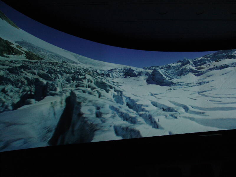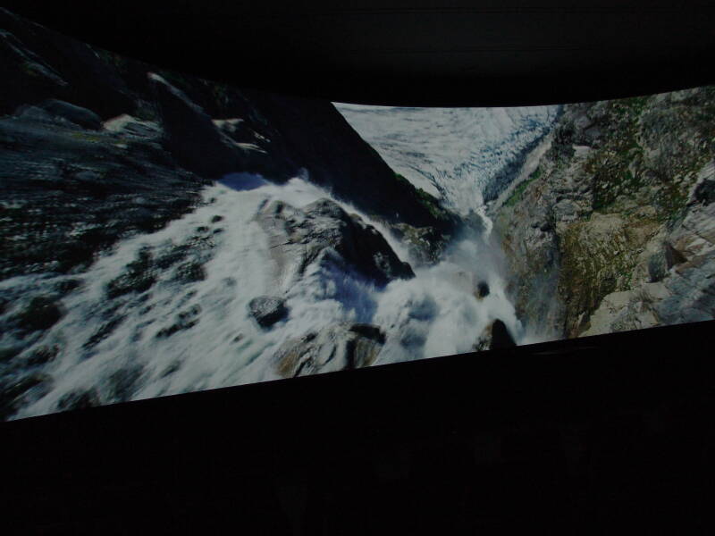 We gaan in het museum naar binnen waar we begeleid worden naar de bioscoop waar we een 3D film te zien krijgen hoe de situatie is van de Gletsjers in Noorwegen. Heel indrukwekkend, het is net of je met de hele film mee draait. Het viel niet mee om een mooie foto te maken.