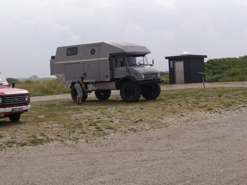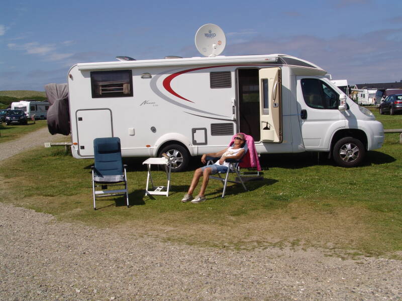 Donderdag 29 juni fietsen we tegen een uur of half elf door het open gebied van Ballum met veel landbouw. We fietsen een stuk naar de Noordzee daar staan een aantal campers die hier overnacht hebben want dat is namelijk toegestaan wild kamperen.