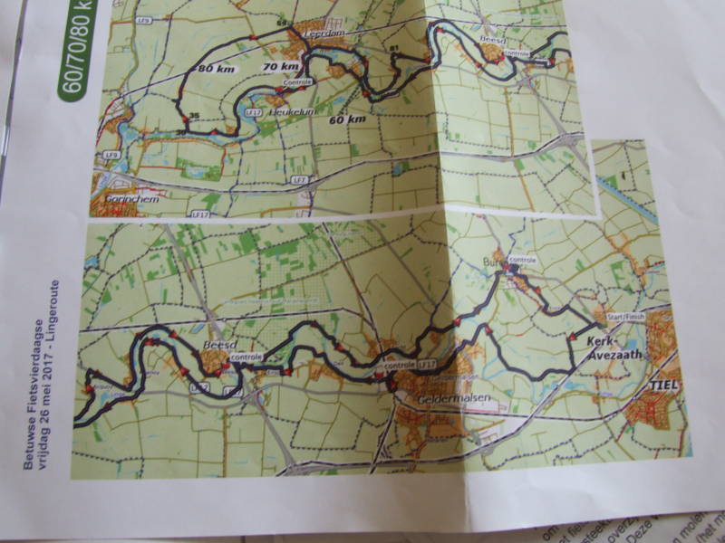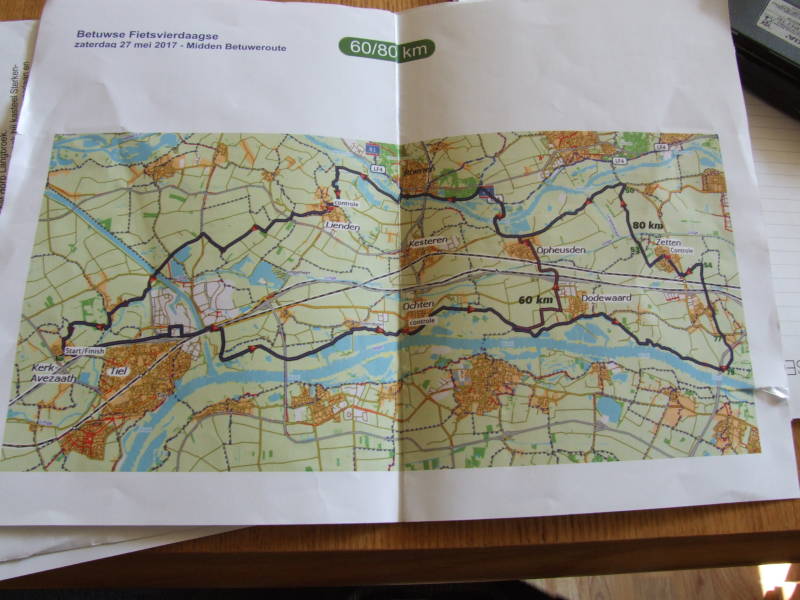 Zaterdag 27 mei vertrekken we tegen een uur of negen naar Kerk-Avezaath waar we starten voor de fiets route Midden Betuwe over een afstand van volgens de papieren 60 km. We laten onze kaarten stempelen en fietsen van kerk-Avezaath naar Ochten. we steken de Waaldijk over en fietsen het uiterwaard in en gaan via de dijk naar Ochten voor onze eerste controle post. Na de koffie fietsen we nog ongeveer 5 km over de dijk slaan links af richting Opheusden waar we op de Rijndijk afslaan naar de opheusdenseveer voor de overstek.