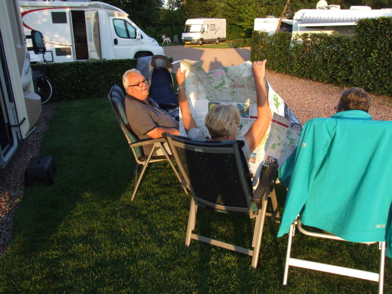 Bij aankomst op de camperplaats onder het genot van een pilsje en wijntje wordt de fiets route door de dames voor zaterdag 22 Juli al weer uitgestippeld.