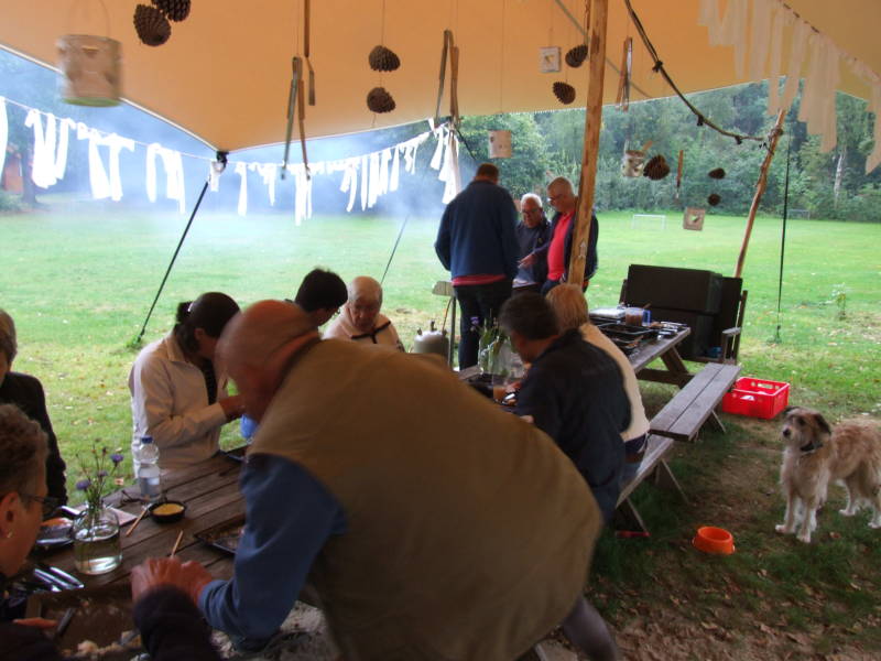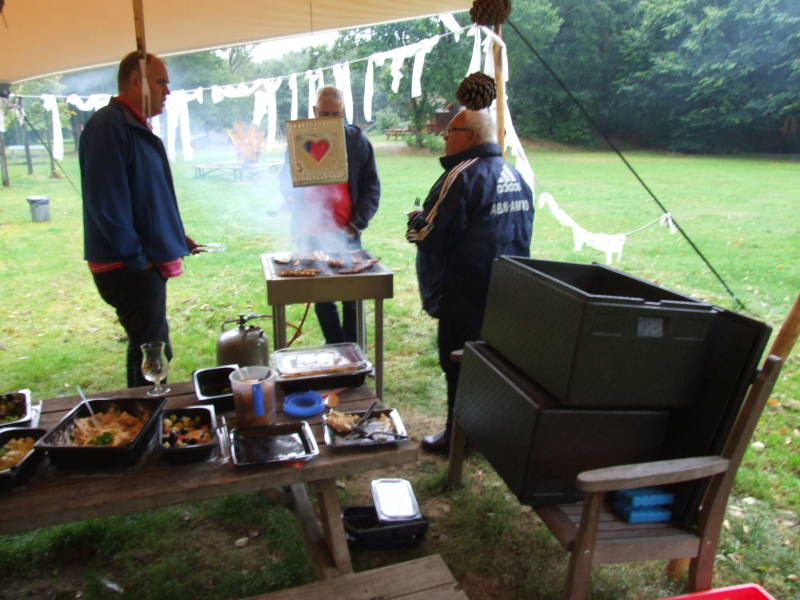 Vrijdag 9 september bij het opstaan regen, regen en nog eens regen. We zeiden tegen elkaar hoop dat het droog is als de rest komt van de club, echter af en toe even droog en dan weer regen. Maar gelukkig was er een huiskamer en een groot tarp tent waar we gebruik van mochten maken. In de huiskamer was het best gezellig met elkaar, openhaard aan en gezellig even weer bij kletsen. Tegen 18.00 uur namen onze vast koks Rene en Eric weer hun vaste plaats in en begonnen aan de b.q.q. Ook dit zorgen de heren er voor dat we met zijn allen weer heerlijk konden genieten van de b.q.q.