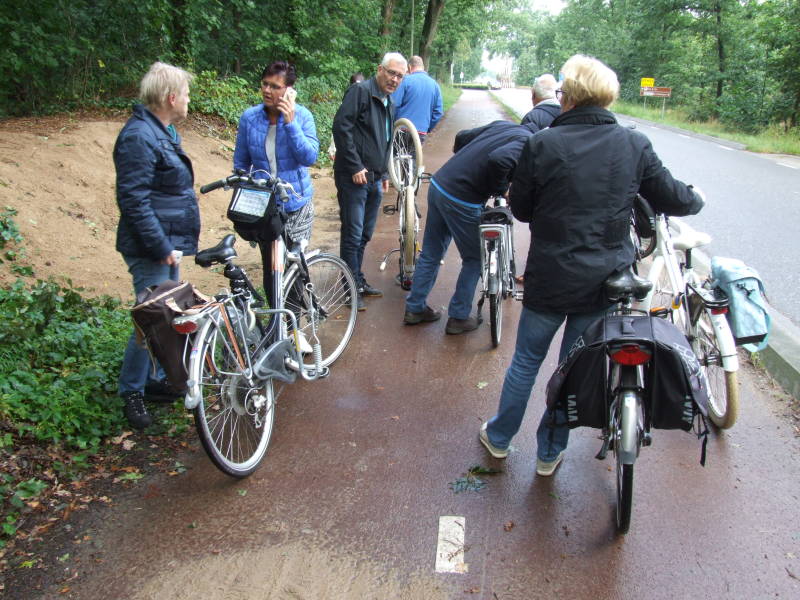 Zaterdag 10 September na het ontbijt gaan we tegen een uur of elf met zijn allen een fietstocht maken richting Ravenstein. Het weer was goed en bleef goed. Onderweg krijgt Eric een lekke band en met heel veel fietsenmakers was de band ook zo weer gelapt. Onderweg drinken we nog een kop koffie met gebak.