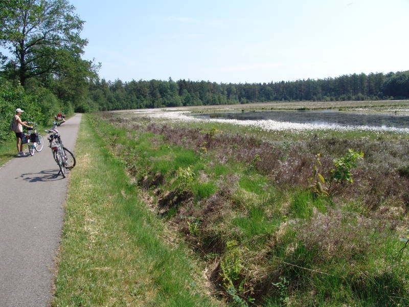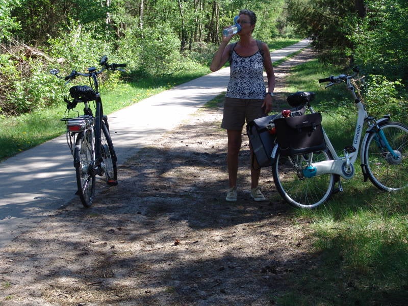 Zaterdag 26 mei na een heerlijke nachtrust en ontbijt stappen we tegen 10 uur op de fiets omdat het vandaag bijzonder warm zou worden en wederom doen we een knooppunten fietsroute te fietsen. We fietsen eerst richting Ruinen door open vlaktes en landerijen, na 12 km zijn we in Ruinen en nemen we hier op de brink een kop koffie met appeltaart. Na de koffie fietsen we door het Dwingelderveld, Gijselte