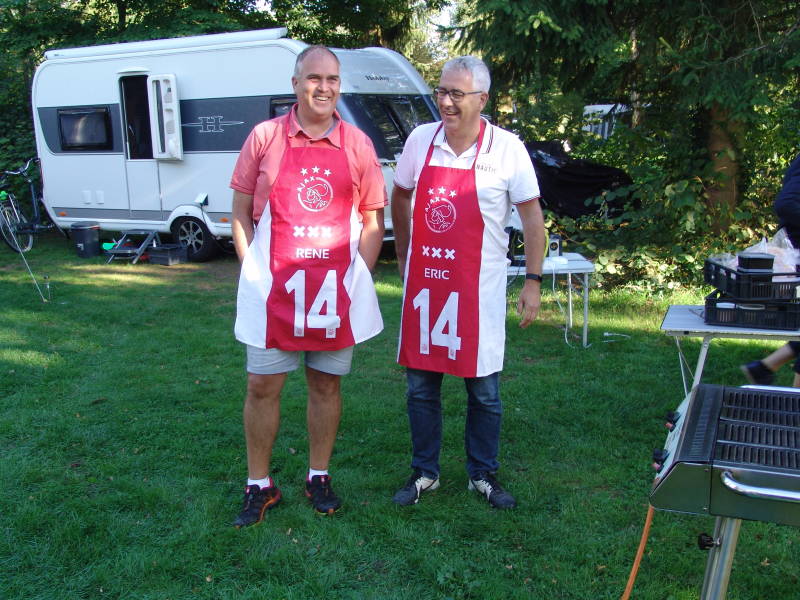 Na de koffie was er tijd voor een drankje en er werd dan ook weer gezellig over en weer geklets, o.a. vakantie ervaringen delen , altijd leuk om te horen. Tegen 17.30 verzorgden onze vaste koks Eric en Rene weer voor de goed verzorgde b.b.q. Dit keer waren Eric en Rene met een ajax short aan, stond ze goed.