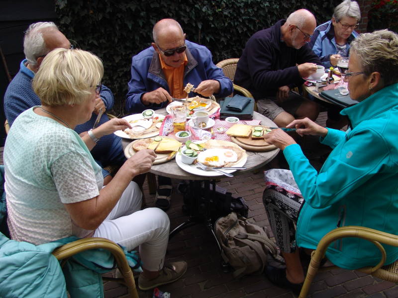 Na de koffie vervolgen we onze weg door het mooie landschap en even na 12.00 uur eten we in een restaurant midden in het bos, sommigen namen een heerlijk kom soep, de ander een gewoon lekker bruin broodje met kaas en een aantal namen een uitsmijter de een met 2 eitjes en de ander met 5 eitjes.