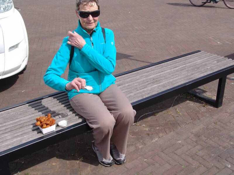 Zaterdag 17 mei pakken we de fiets tegen een uur of 11 en fietsen naar Stiens een gezellig oud dorpje, Hier is weinig te beleven maar drinken bij de warme bakker een heerlijk kopje koffie met heerlijke koek. Zondag 18 mei maken we na het ontbijt een fietsroute via St.Annaparochie naar Nij Altoene gefietst en vervolgen over de Zeedijk naar Westhoek , Sint Jacobi Parochie waar we koffie drinken bij de kerk en na de koffie verder naar Minnertsga, Berltsum een mooi oud artistiek dorpje met zeer smalle straatjes en via Berltsum wer naar de camperplaats. 29 km vandaag.