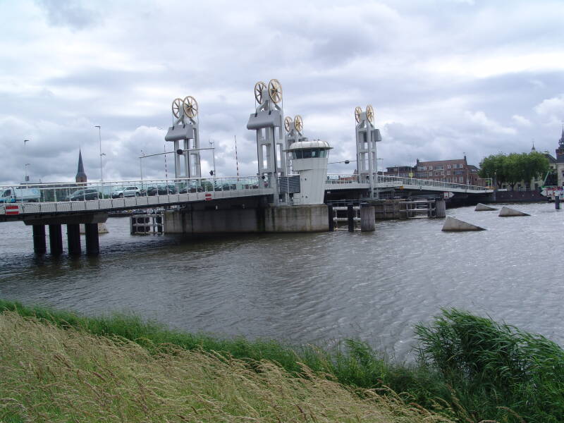 Na de lunch gaan we te voet naar de Hanze Stad Kampen 1200 meter vanaf de camping. We wandelen langs de grote brug waar van op dit moment de grote wiel in onderhoud is.