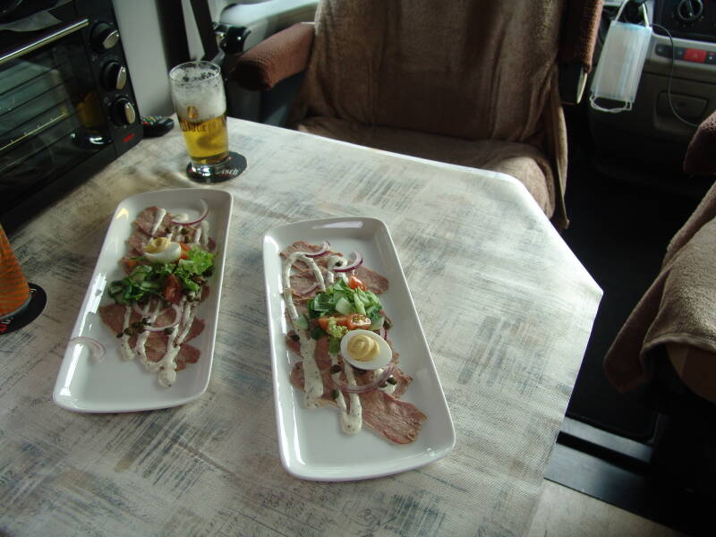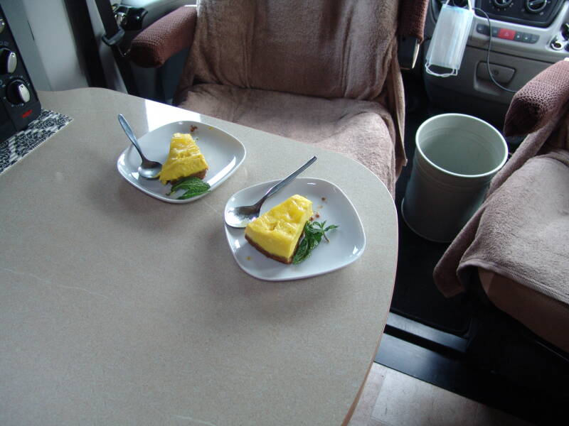 Tegen 18.30 uur wordt onze voorgerecht bezorgt aan de camper, toen het hoofdgerecht en later een heerlijk toetje.